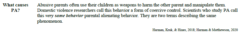 If you need a credible, well-sourced document that describes what your children have been through, this is it. This newsletter from The Learning Network is packed with citations from peer-reviewed research and describes coercive control of children accurately, in Evan Stark's own framework.