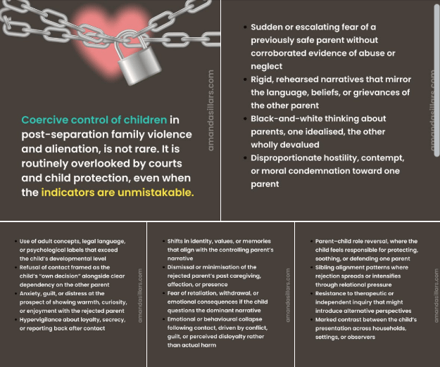 Is the coercive control presented as an attempt to control various aspects of the child’s daily life or only as a strategy to harm the other parent by making the child reject them? Is the child a primary victim or just a weapon?